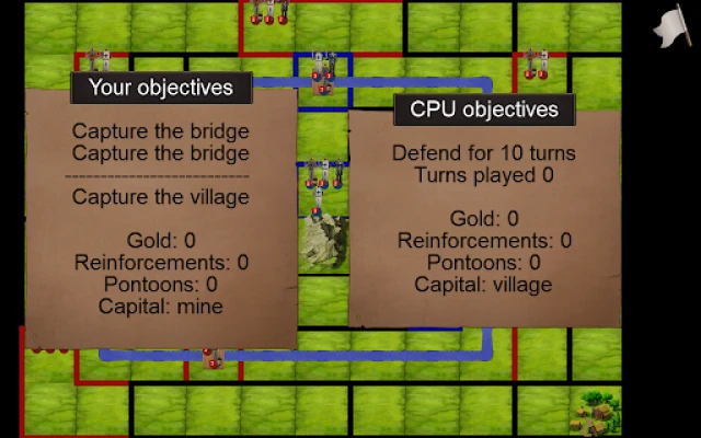 The game includes 24 custom built maps with 4 of them come for free. Each map contains its own unique geographical features such as water, plains, forests, rivers and mountains. There are also villages, farms and castles that provide defensive bonuses to the troops occupying those buildings. Each map forces players to come up with a different battle strategy.