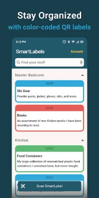 Easily organize your storage from your mobile phone. Smart Labels are QR codes that your phone can scan and manage. In the app, add photos, names, and descriptions of each item in your box. Later, when you want to find an item, search for it in the app to find its exact location, along with the label’s color and ID.